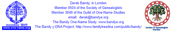 This website is dedicated to promoting interest in, and contact among members of, the worldwide Bandy family. The site focuses on research into the history and genealogy of the Bandy family.  We depend entirely on contributed material to keep this site fresh and interesting so please keep sending me your genealogies, raw data, opinions, photographs and news. Our policy is to try to publish everything we get.  My thanks to all who helped us.